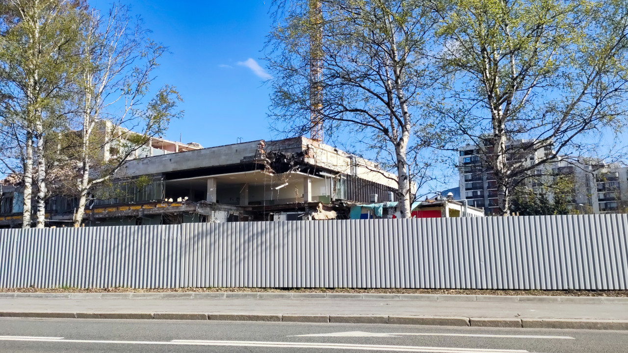 На снимке показано здание, находящееся в процессе демонтажа: часть перекрытий и стен уже удалена, видны обнажённые конструкции и повреждённые участки. Перед объектом установлен ровный забор из профнастила, отделяющий стройплощадку от тротуара. В кадре присутствуют несколько берёз, а также современные жилые дома на заднем плане. Сцена может использоваться в материалах, посвящённых сносу, реконструкции и обновлению городской застройки.