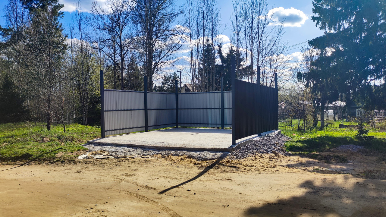 На фото изображена частично ограждённая металлическим забором площадка с бетонным основанием, расположенная в окружении деревьев и кустарников. Основание выполнено из светлого бетона, вокруг которого насыпаны участки гравия и грунта. Видны металлические стойки конструкции, готовые к дальнейшему монтажу. Снимок сделан при солнечном дневном освещении. Изображение можно использовать для материалов о строительстве, благоустройстве и подготовке площадок под контейнеры или хозяйственные объекты.