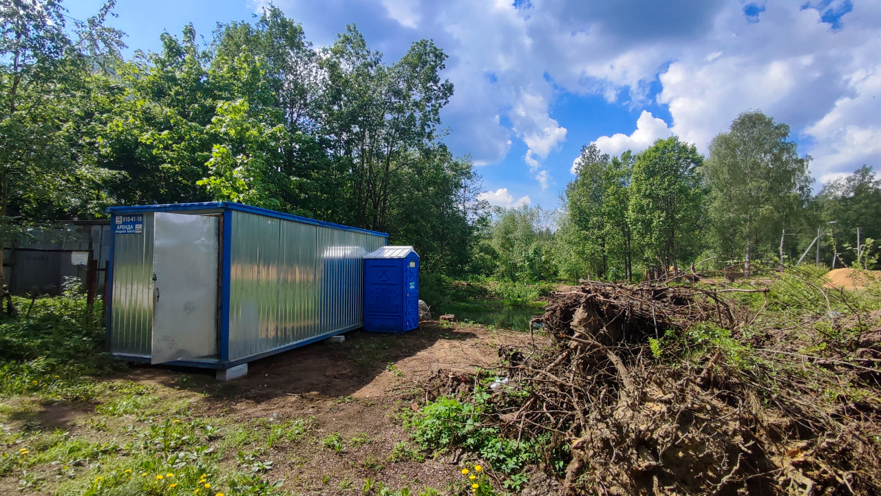 строительная площадка стройка стройплощадка строительный участок строительство строительные работы строительный модуль бытовка биотуалет лес расчистка территория экология подготовительные работы временные сооружения вырубка кустарники деревья ветки корни инженерная инфраструктура логистика строительства природная зона открытый участок металлический контейнер санитарные условия техника временная база оборудование рабочая зонаПохожие фотографии