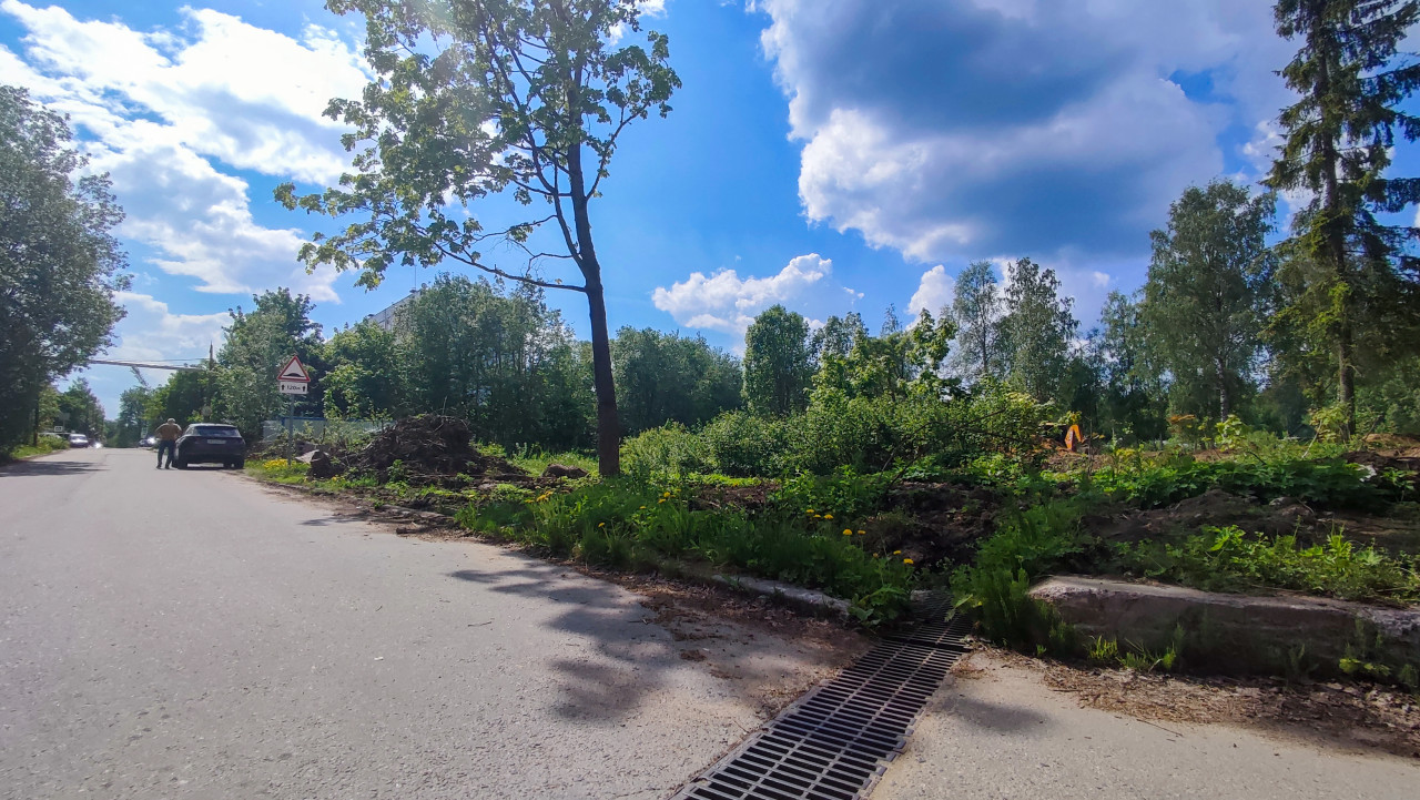 На фотографии показан асфальтированный участок дороги, проходящий вдоль территории с частичной вырубкой растительности. На переднем плане располагается решётка дождевого стока и обочина с зелёной травой и одуванчиками. Видны piles of roots and branches — остатки расчистки. На дороге стоит автомобиль, рядом с которым идёт человек. В глубине кадра видны дорожный знак, деревья и фрагменты жилой застройки. Снимок подходит для материалов о дорожной инфраструктуре, благоустройстве территории, расчистке участков и городской экологии.