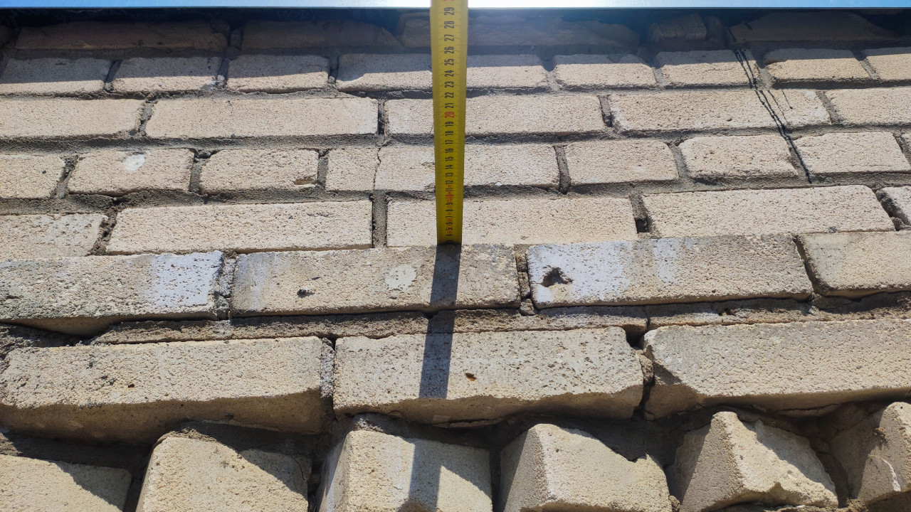 На фото представлен вертикальный замер кирпичной стены с использованием измерительной рулетки, которую держат между верхней частью фасада и выступающим рядом кладки. Камера направлена снизу вверх, что позволяет увидеть несколько рядов кирпичей, включая участки с повреждениями и неравномерностью швов. Отчётливо видны дефекты кирпича, включая трещины и частичное выкрашивание. Измерение фиксирует разницу уровней между ровной частью стены и выступающей зоной, что применяется при оценке необходимости ремонта. Фотография может использоваться в инженерных отчётах, экспертных заключениях, техническом надзоре и обучающих материалах о методах обследования фасадов.