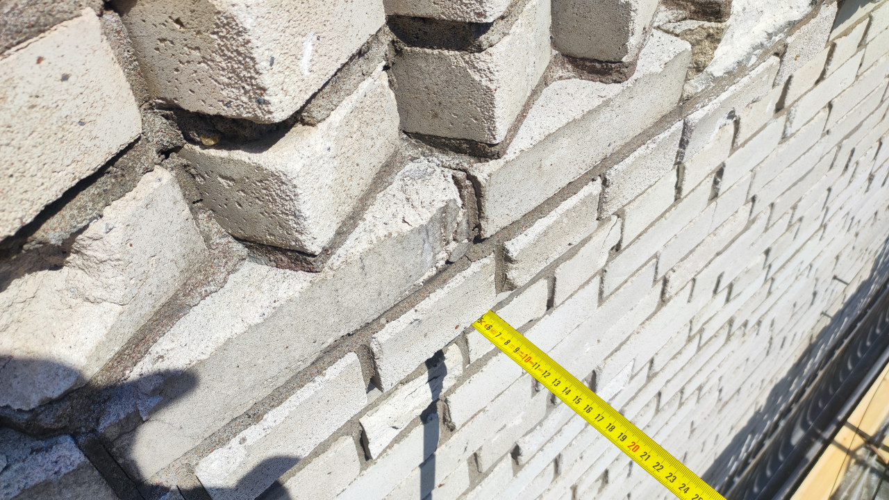 На фотографии показан фрагмент кирпичной стены, к которой прикладывается измерительная рулетка, фиксирующая величину смещения наружного ряда кладки относительно основной поверхности. Видно, что внешний ряд кирпичей частично выступает, а в некоторых местах материал повреждён. Рулетка показывает расстояние, используемое для оценки степени деформации и подготовки к ремонтным работам. На фоне различимы тени и элементы фасада, выполненного из светлого кирпича. Изображение можно использовать в строительной экспертизе, отчётах о техническом состоянии зданий, презентациях по обследованию фасадов и учебных материалах по диагностике конструкций.