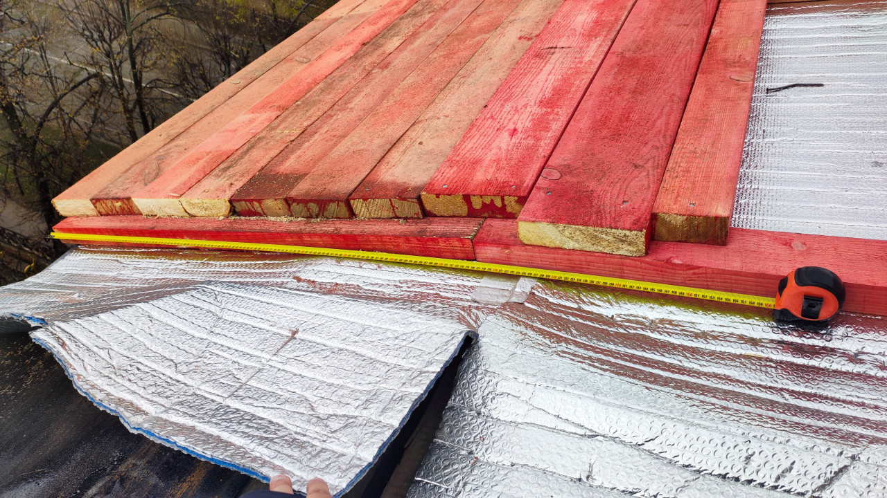 На изображении показан край кровельного ската, где на фольгированном утеплителе размещены уложенные деревянные доски. Перед досками расположена разложенная строительная рулетка, фиксирующая длину обшивки. В нижней части заметна рука, удерживающая край утеплителя. На заднем плане видны ветви деревьев, что подчёркивает высотный характер работ. Снимок иллюстрирует этап точных замеров при монтаже кровельного покрытия.
