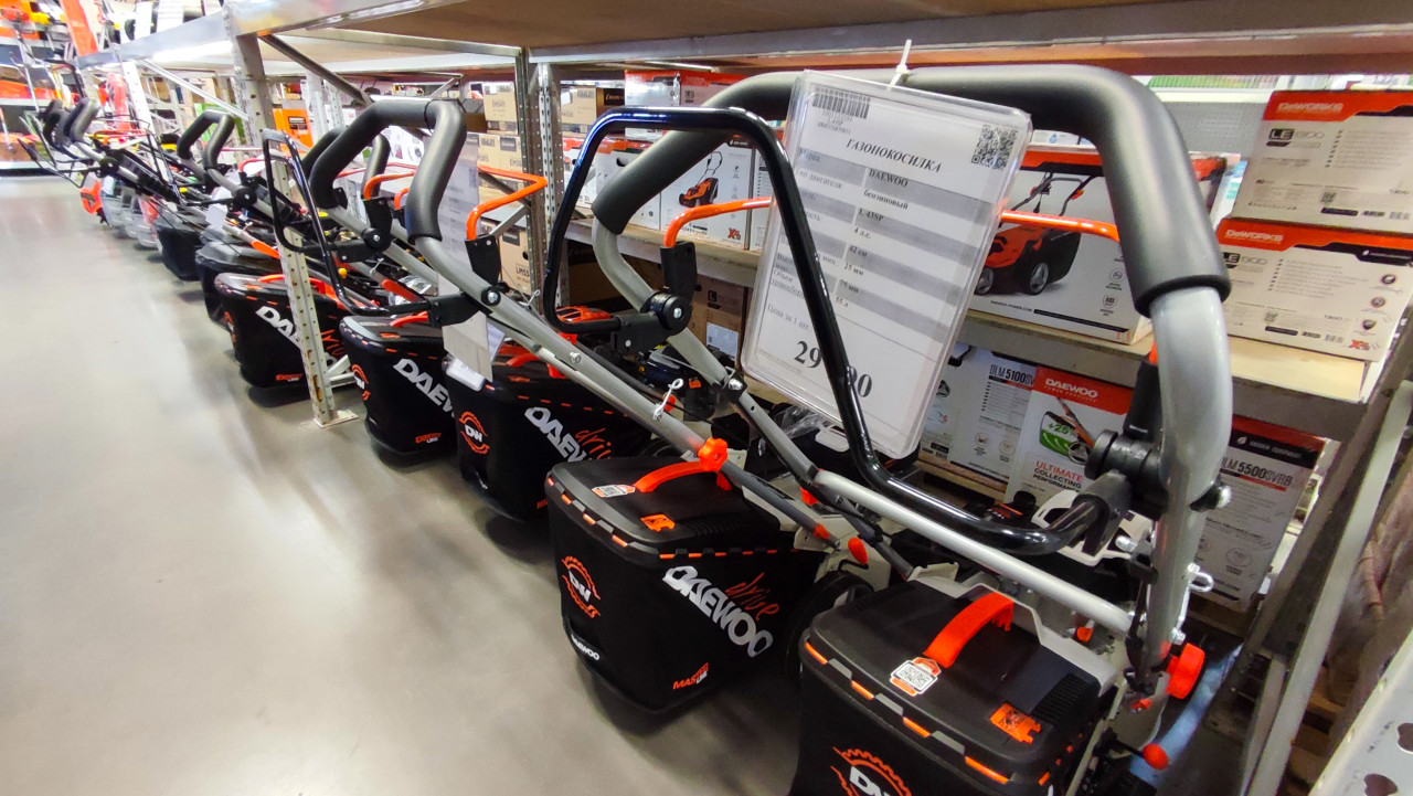 садовая техника магазин ритейл оборудование для сада ассортимент витрина выбор техники дачный инвентарь газонокосилка бензиновая косилка Daewoo выбор оборудования стеллаж инвентарь для дачи уход за газоном техника для сада моторная косилка ценник характеристики торговая полка оборудование дачный участок бензиновый двигатель корпус косилки склад розничная торговля бытовая техника садовый магазин инструменты для газонаПохожие фотографии