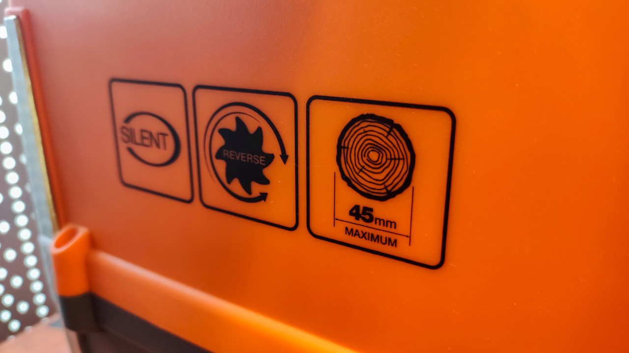 На фото показан крупный план пиктограмм, размещённых на оранжевом корпусе садового измельчителя. Символы обозначают тихий режим работы, реверсный ход ножей и максимальный диаметр перерабатываемых веток 45 мм. Поверхность корпуса матовая, а черные линии пиктограмм чётко выделяются на ярком фоне. Снимок подходит для материалов, посвящённых функционалу оборудования, инструкциям и визуализации технических обозначений.