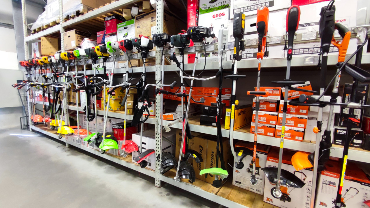 садовая техника магазин ритейл оборудование для сада ассортимент витрина выбор техники дачный инвентарь триммер кусторез стеллаж оборудование RedVerg Daewoo Huter режущая головка защитный кожух рукоятка торговый зал коробки инвентарь для сада инструменты для травы выставка техника для участка подвесной держатель выкладка товара оборудование для ухода бытовая техника моторный инструментПохожие фотографии