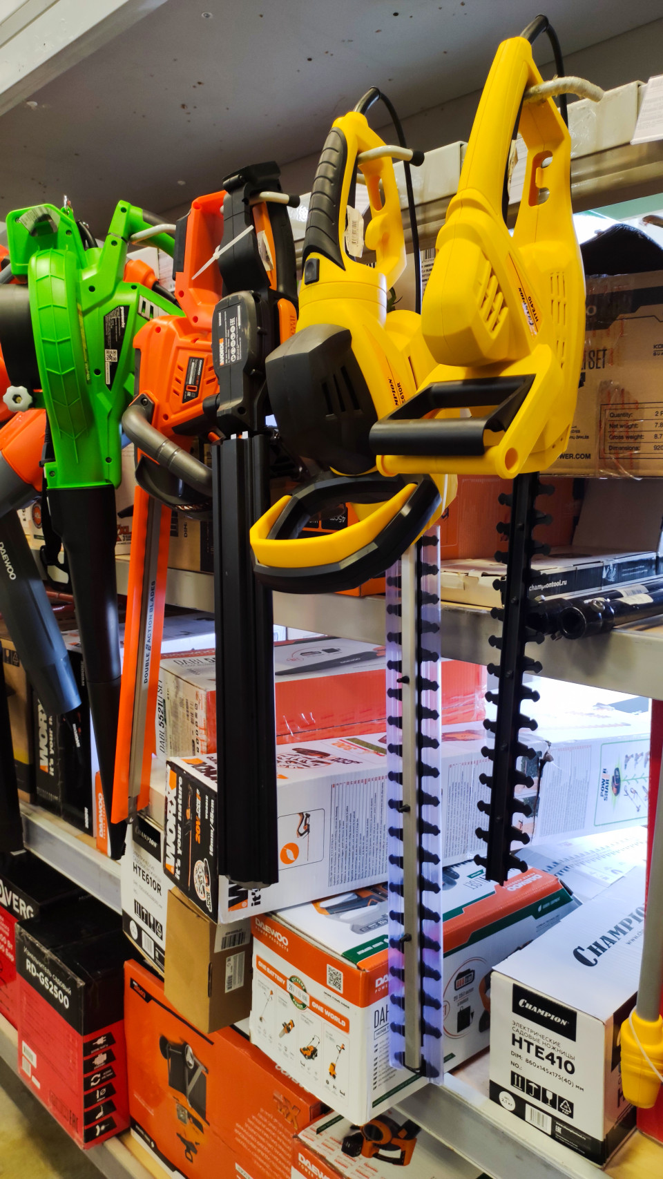 садовая техника магазин ритейл оборудование для сада ассортимент витрина выбор техники дачный инвентарь кусторез электрический кусторез стеллаж инструменты режущая шина защитный кожух рукоятка кабель питания RedVerg Champion Daewoo инвентарь для дачи электроинструмент уход за растениями коробки садовый инвентарь торговый зал выставка оборудования режущий инструментПохожие фотографии
