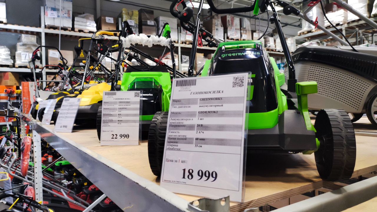садовая техника магазин ритейл оборудование для сада ассортимент витрина выбор техники дачный инвентарь газонокосилка Greenworks Champion аккумуляторная техника электрическая косилка стеллаж ценник характеристики уход за газоном оборудование моторный инструмент дачный участок аккумулятор колесная база корпус торговое оборудование яркие цвета склад выставочная полка техника для сада обзор моделейПохожие фотографии