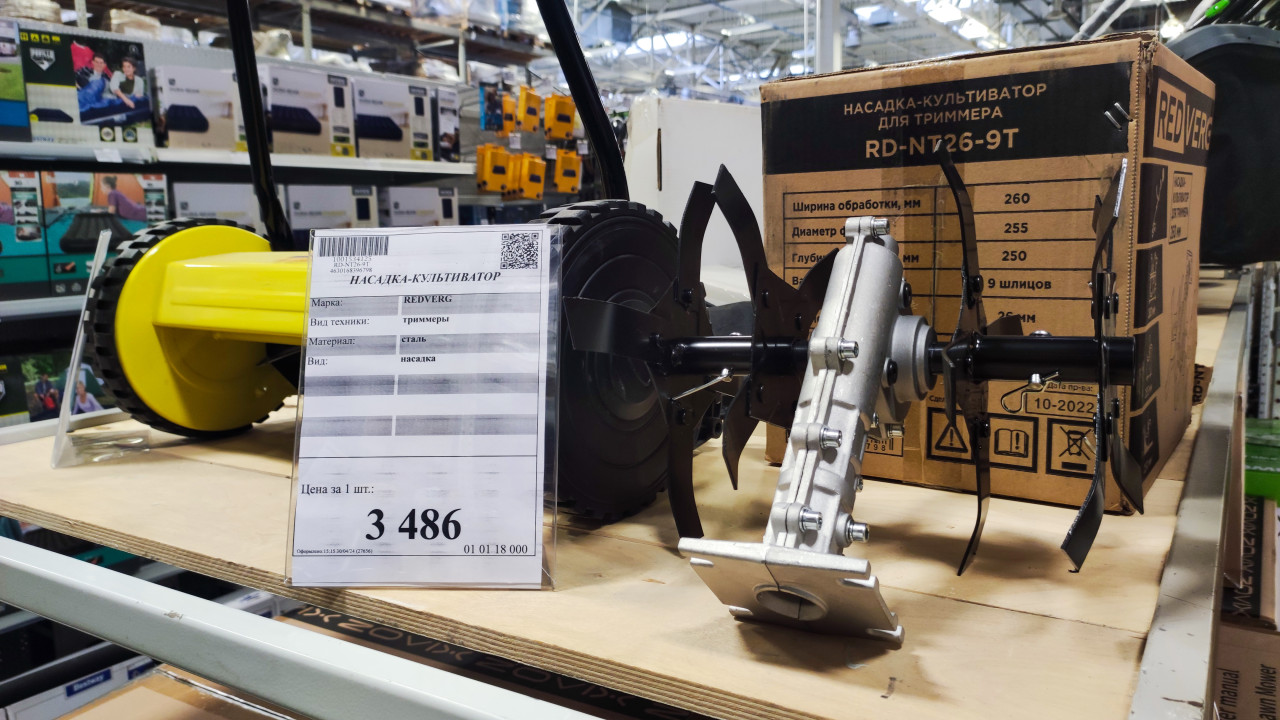 садовая техника магазин ритейл оборудование для сада ассортимент витрина выбор техники дачный инвентарь насадка фреза RedVerg триммер редуктор оборудование обработка грунта стеллаж коробка характеристики RD NT26 9T фрезерная головка металлические фрезы комплект садовый инструмент деревянная полка аксессуар навесное оборудование инвентарь для дачи упаковка крепёж товары для садаПохожие фотографии