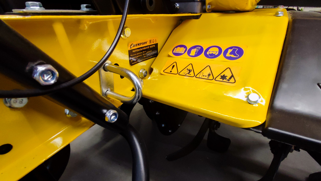 садовая техника магазин ритейл оборудование для сада ассортимент витрина выбор техники дачный инвентарь мотокультиватор крепление У образная скоба рама желтый корпус фрезы болты гайки кабель защитные элементы предупреждения пиктограммы табличка модели оборудование механизм металлические детали сельхозтехника обработка почвы технические узлы инструмент привод конструкция механизацияПохожие фотографии