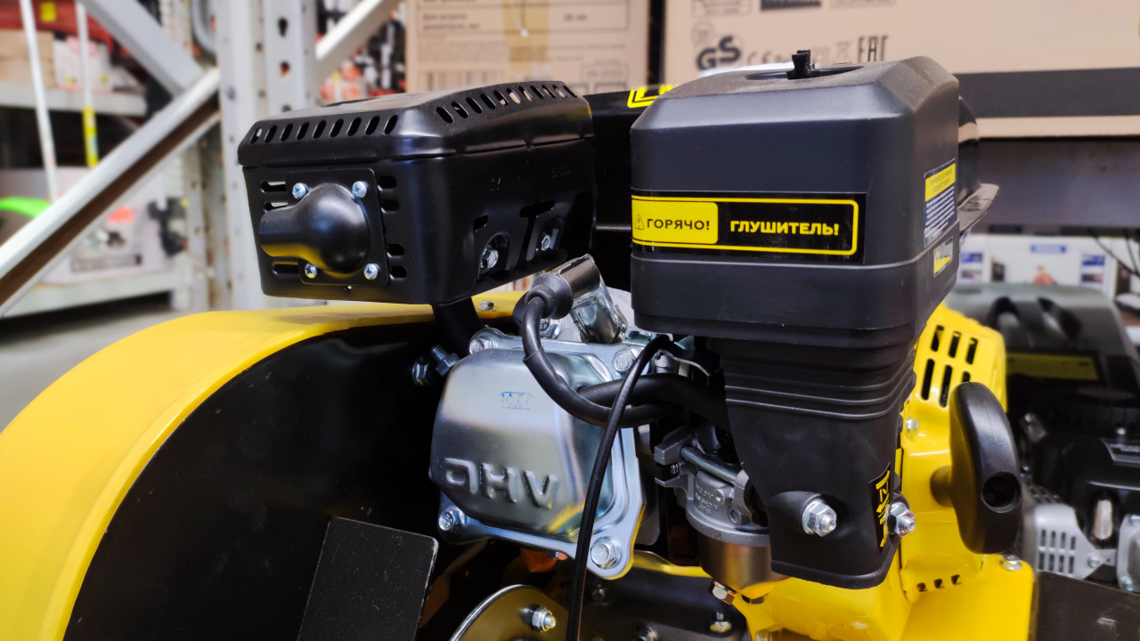 садовая техника магазин ритейл оборудование для сада ассортимент витрина выбор техники дачный инвентарь мотокультиватор двигатель OHV глушитель бензиновый мотор оборудование металлический кожух кабели провод зажигания магазин техники предупреждающая наклейка технические детали цилиндр система выхлопа корпус жёлтый элемент механизация обработка почвы двигатель внутреннего сгорания болтовые соединения вентиляция привод агрегат конструкция эксплуатацияПохожие фотографии