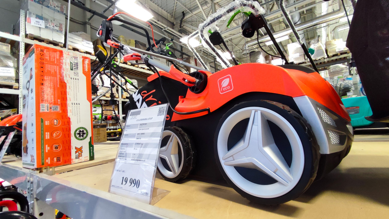 садовая техника магазин ритейл оборудование для сада ассортимент витрина выбор техники дачный инвентарь скарификатор Daewoo электрический инструмент большие колёса боковой вид корпус оранжевый пластик инвентарь оборудование обработка газона устройство электропривод стеллаж упаковки торговый зал демонстрация каталог инструмент бытовая техника травосборник колесная базаПохожие фотографии