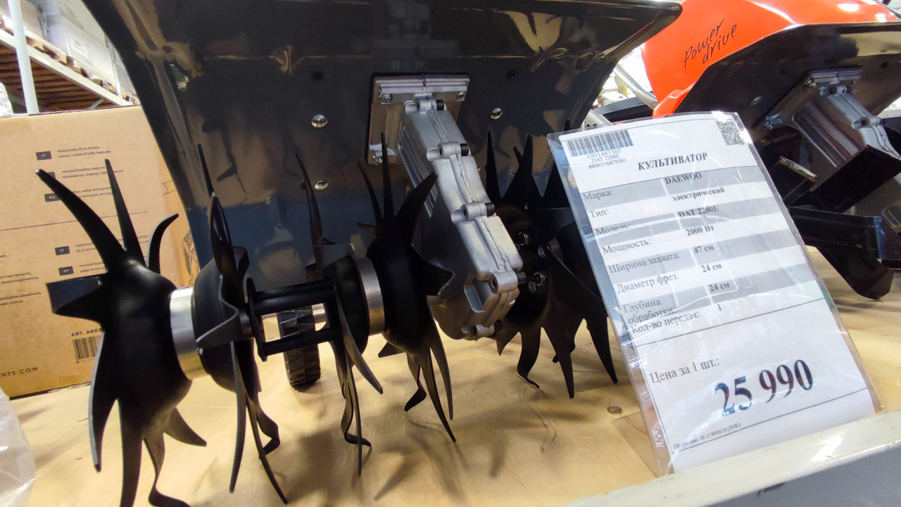 садовая техника магазин ритейл оборудование для сада ассортимент витрина выбор техники дачный инвентарь культиватор DAEWOO DAT 2200E фрезы металлические фрезы крупный план редуктор ценник характеристики товара обработка почвы инструмент для огорода электрический культиватор стеллаж демонстрация товара бытовая техника техника для дачи электрический инструмент демонстрационный образец каталог товаров механизация оборудованиеПохожие фотографии