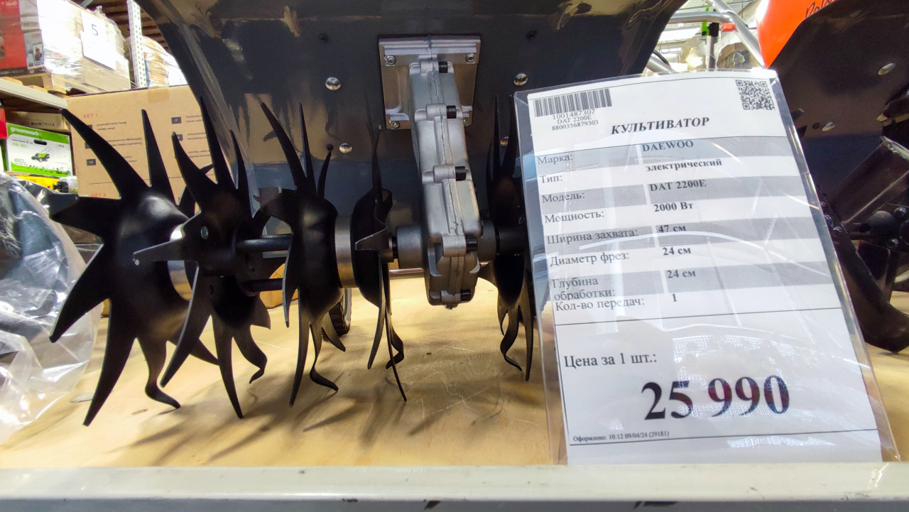 садовая техника магазин ритейл оборудование для сада ассортимент витрина выбор техники дачный инвентарь культиватор DAEWOO DAT 2200E электрический культиватор фрезы редуктор ценник характеристики оборудование обработка почвы инструмент для огорода стеллаж демонстрация товара техника для дачи электрический инструмент коробки торговая точка бытовое оборудование механизация каталог товаров демонстрационный стендПохожие фотографии