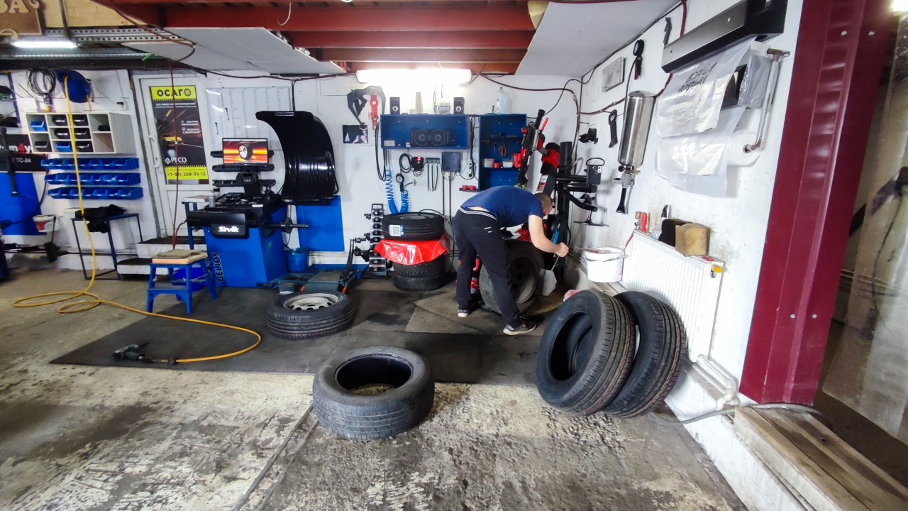Мастер шиномонтажа за работой в сервисном помещении
