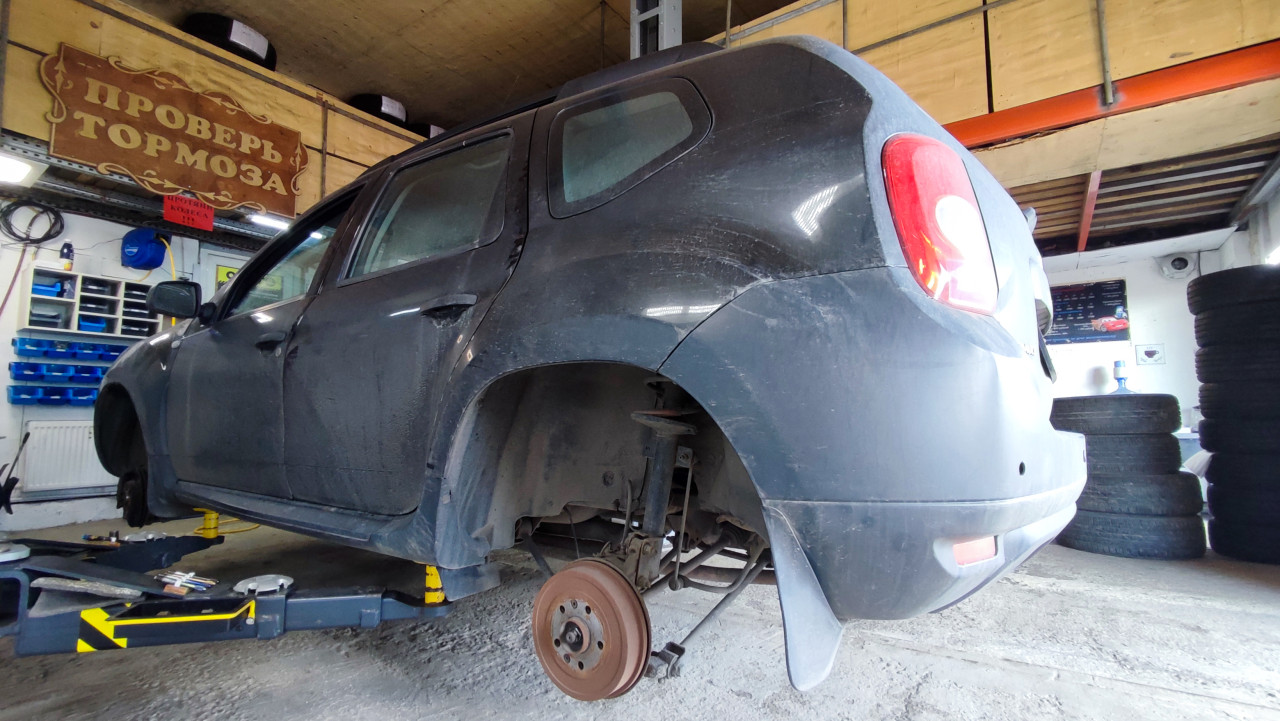 Автомобиль на подъёмнике с демонтированным задним колесом