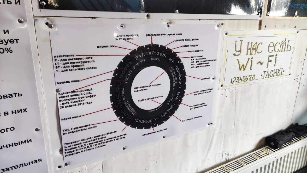 На изображении представлен настенный информационный стенд, посвящённый параметрам и маркировке автомобильных шин. В центре показана схема в виде шины с подписями, описывающими индекс скорости, нагрузку, тип конструкции, размеры, направление вращения и другие характеристики. Справа закреплена самодельная табличка с надписью о наличии Wi-Fi. Снизу видна часть радиатора отопления. Фото пригодно для образовательных материалов, тематики автосервиса и инструкций по подбору шин.