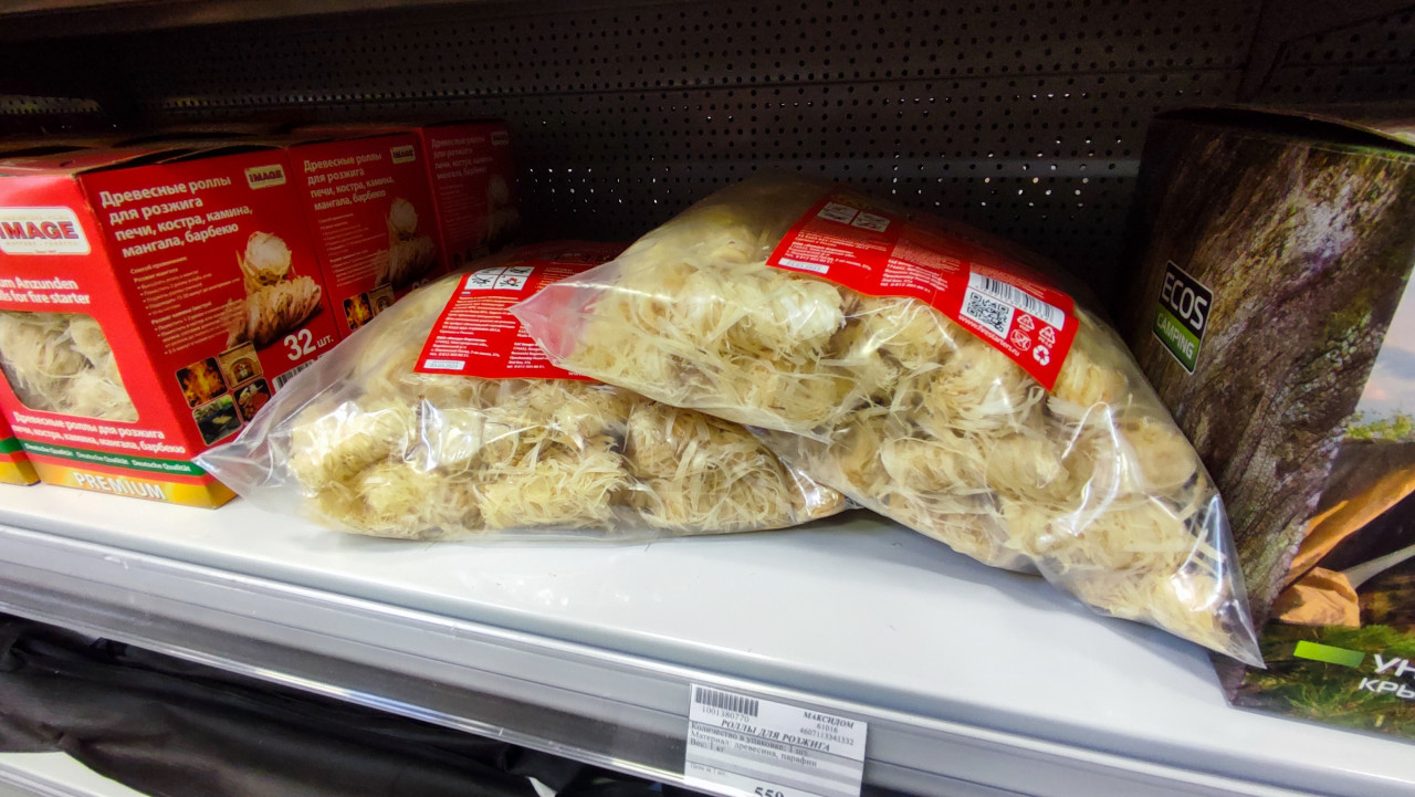На фотографии показаны прозрачные пакеты с древесными роллами для розжига, уложенные друг на друга на полке магазина. На заднем плане расположен ряд коробок с аналогичными разжигателями. Пакеты содержат плотные комки древесной стружки, пропитанные парафином. Съёмка выполнена в помещении магазина при искусственном освещении. Изображение подходит для материалов о товарах для розжига, выборе растопочных средств и представлении ассортимента хозяйственных отделов.