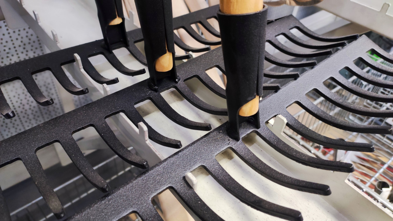 Металлические грабли с деревянными черенками на торговом стеллаже