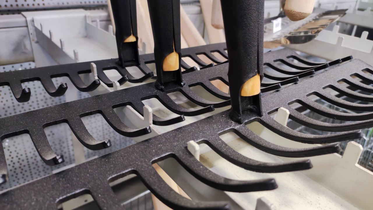 На изображении показаны металлические грабли черного цвета, закрепленные на деревянных черенках, размещенные на торговом стеллаже. В кадре видны зубья инструмента, крепежные элементы и часть соседних черенков. На фоне присутствуют металлические направляющие и элементы стеллажа, характерные для хозяйственного магазина. Снимок может использоваться для интернет-каталогов, информационных материалов о выборе садового инвентаря и иллюстраций к товарам для участка.