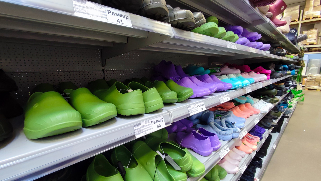 магазин садовый магазин товары для дачи товары для сада и огорода садовые товары розничная торговля витрина магазина стеллаж с товаром сезонные товары садовая обувь галоши сабо разноцветная обувь полки магазина ассортимент обуви размер 41 размер 39 цветная обувь зелёные галоши фиолетовые сабо голубая обувь розовая обувь белые сабо перфорированный стеллаж обувной отдел полимерная обувь женская обувь мужская обувь дачный ассортимент обувные рядыПохожие фотографии