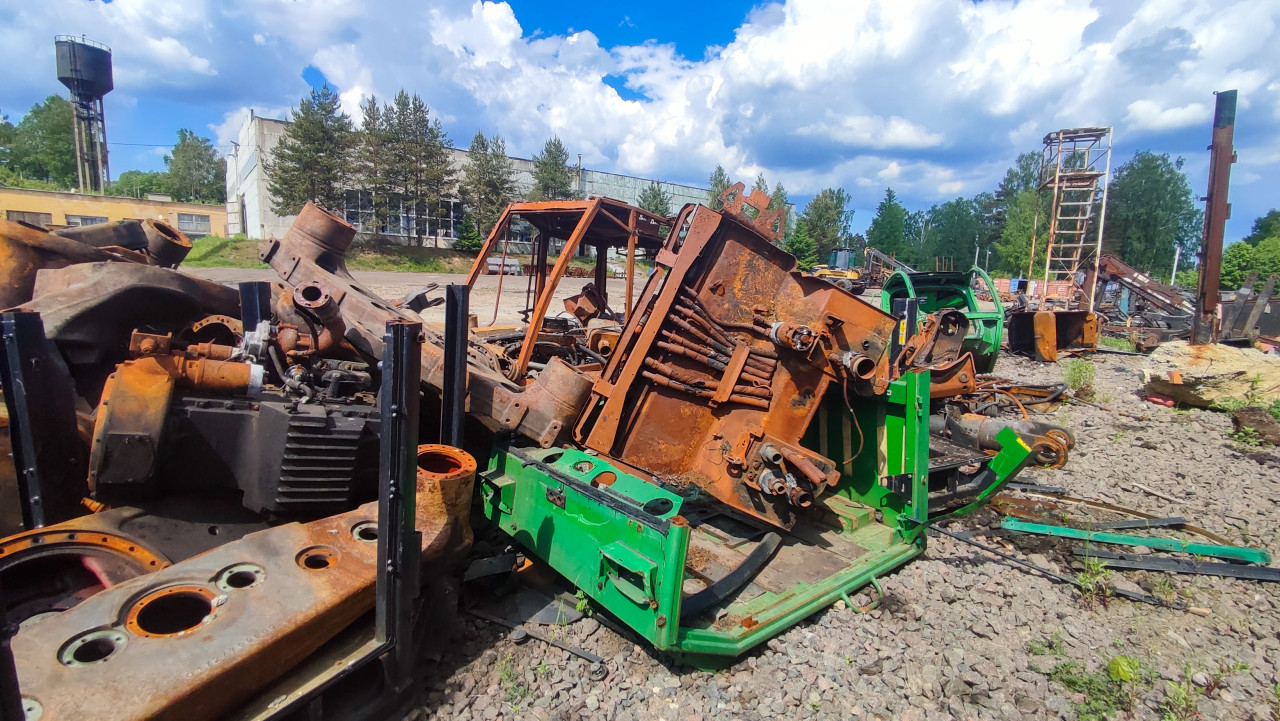 На изображении представлены массивные элементы демонтированной техники, включая раму кабины, блоки корпусов, фрагменты гидравлических систем и трубопроводов. Металл на многих деталях покрыт ржавчиной, что подчёркивает длительное пребывание на открытом воздухе. На дальнем плане видны производственные корпуса, лесной массив, стационарные конструкции и техника, размещённая на территории. Щебёночное основание и разбросанные элементы создают характерную индустриальную картину. Фотография подходит для материалов о металлоломе, демонтаже, обслуживании техники и исследованиях промышленных площадок.