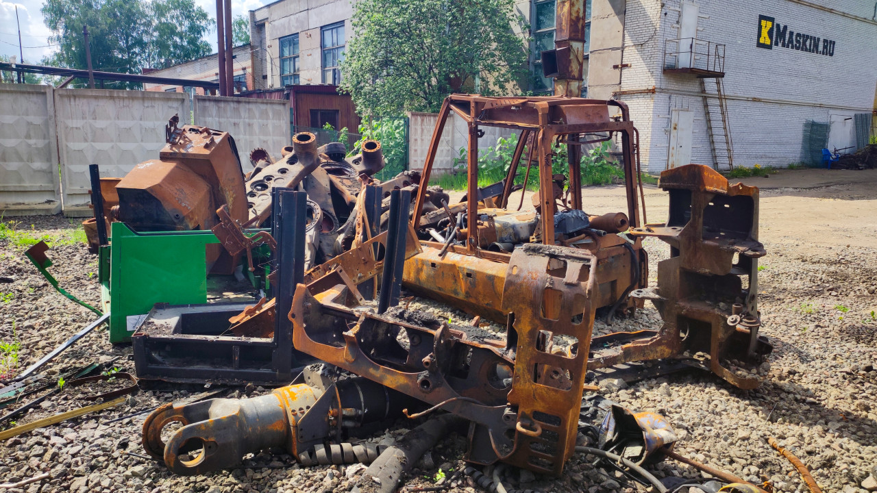 На фотографии изображены крупные фрагменты демонтированной техники, среди которых видна рама кабины, элементы корпусов и металлические детали, лежащие на щебёночном основании. Многочисленные трубки, гидравлические узлы и изношенные механизмы свидетельствуют о разборке тяжёлого оборудования. На заднем плане находятся производственные здания с кирпичными стенами, а также белый промышленный забор, отделяющий площадку. Присутствуют кустарники и деревья, что подчёркивает смешанный характер территории. Снимок подходит для материалов о демонтаже техники, переработке металла, эксплуатации промышленных объектов и истории оборудования.