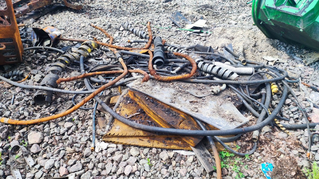 На фотографии показана крупная россыпь металлических труб, шлангов, фрагментов гидролиний и изношенных деталей, лежащих на щебнистом покрытии. Среди них заметны ржавые спиральные элементы, части армированных рукавов, обрывки креплений и фрагменты металлических пластин. На заднем плане виден небольшой участок промышленной площадки и часть зеленого оборудования. Снимок отражает процесс разборки или утилизации техники и может быть использован в материалах о переработке отходов, техническом обслуживании, промышленной безопасности и анализе состояния оборудования.