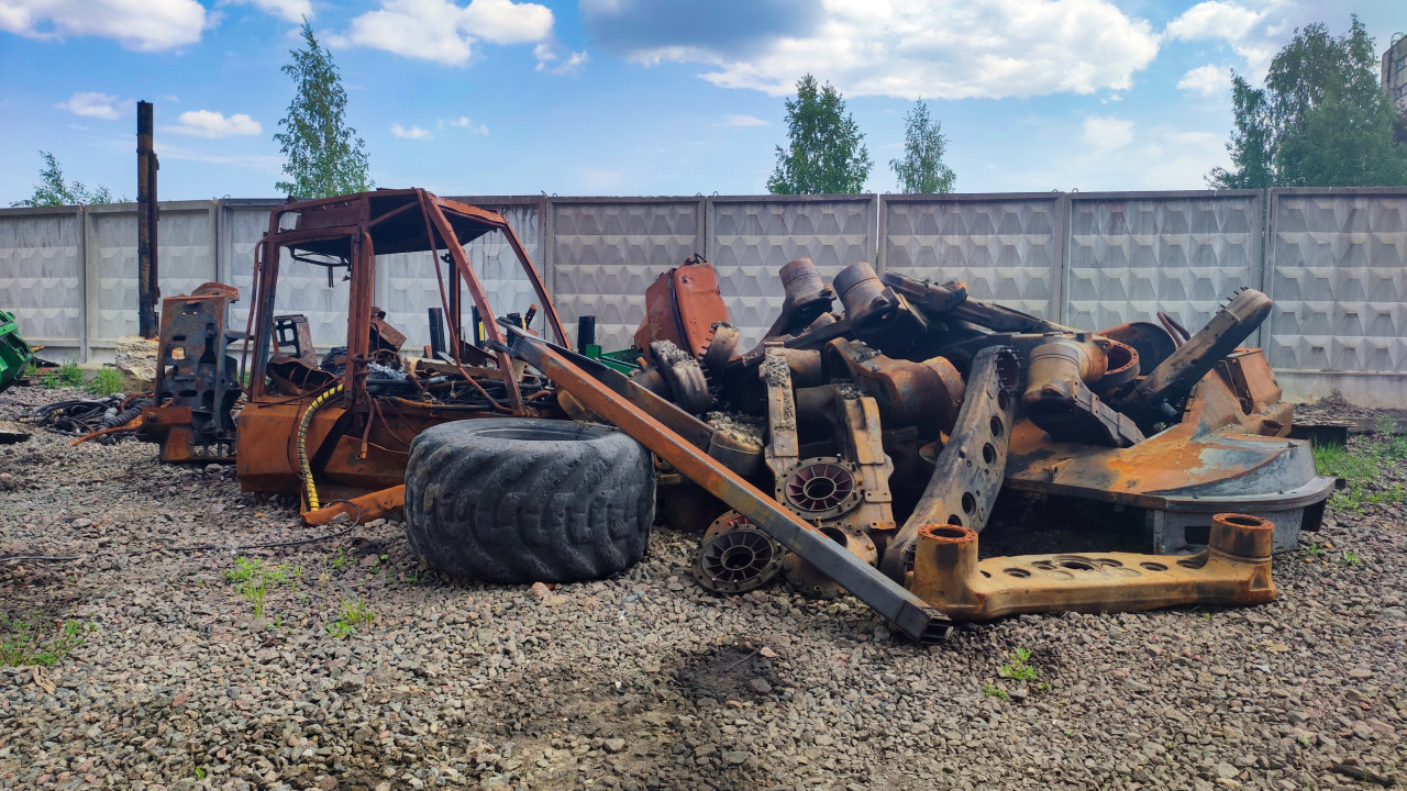 На фотографии изображены фрагменты разобранной техники, включая повреждённые рамы, корпуса, оси и крупные металлические элементы с выраженной коррозией. Центральное место занимает остов машины с обгоревшими и деформированными панелями. Слева частично видны другие металлические конструкции, а справа — крупное колесо и разрозненные детали. Фоном служит бетонный защитный забор и деревья. Съёмка выполнена днём, что позволяет рассмотреть износ и структуру материалов. Кадр подходит для материалов о демонтаже техники, переработке металла и визуальной документации производственных территорий.