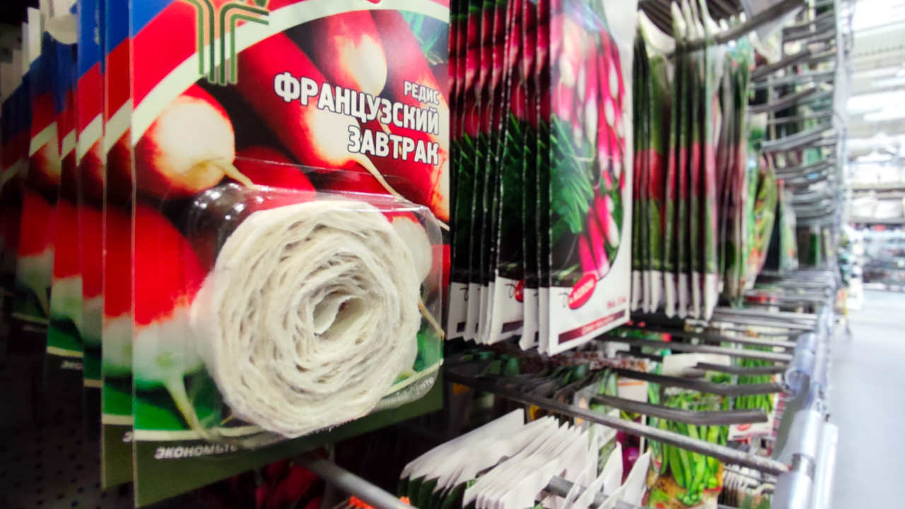 Пакеты семян редиса на витрине садового отдела