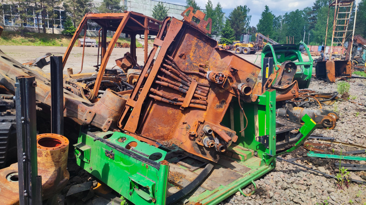 На фотографии изображены массивные фрагменты техники, уложенные на зелёную металлическую платформу. Видны крупные блоки, трубопроводы, гидравлические узлы и панели, покрытые выраженной коррозией. В глубине кадра различимы производственные сооружения, деревья и открытая площадка с техникой, что формирует облик действующей или заброшенной промзоны. Множественные болтовые соединения, отверстия под крепежи и фланцы указывают на демонтаж тяжёлого оборудования. Такой снимок востребован в материалах о техническом обслуживании, утилизации машин, промышленном анализе и работе ремонтных баз.