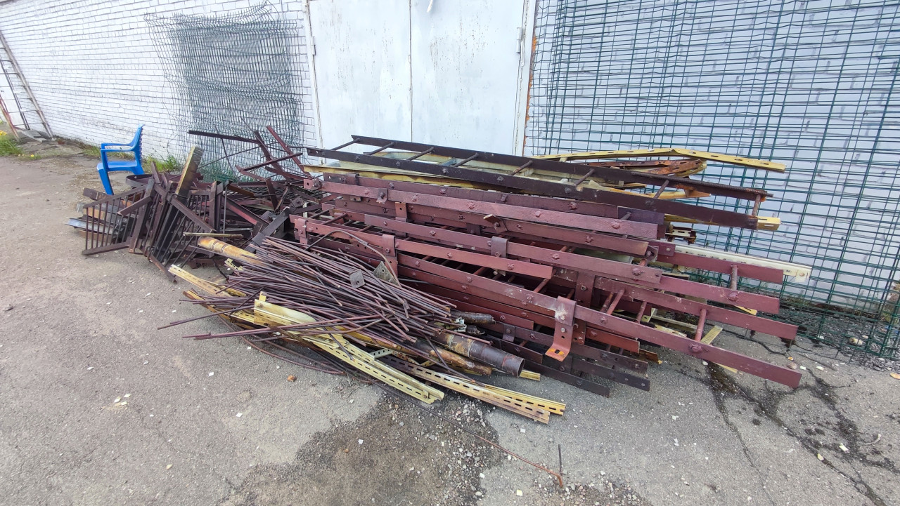 На фотографии изображена куча металлолома, состоящая из металлических секций, опор, арматурных стержней и труб, уложенных на асфальтовой площадке у стены светлого кирпичного здания. Справа заметны вертикальные металлические решётки, прислонённые к фасаду. На заднем плане видны элементы дверного проёма и фрагменты инженерных конструкций. Освещение дневное, позволяющее различить структуру металла и следы коррозии на отдельных деталях. Кадр может использоваться в материалах о промышленной переработке, визуальных исследованиях производственных зон и инфраструктуре предприятий.