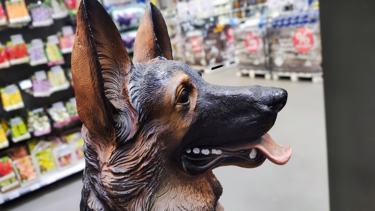 магазин садовый магазин товары для дачи товары для сада и огорода садовые товары розничная торговля витрина магазина стеллаж с товаром сезонные товары собака фигурка садовый декор декоративная фигура профиль полимерные изделия роспись текстура шерсти торговый зал интерьер товары для сада витрина крупный план ландшафтный дизайн декоративные элементы садовый отдел ритейл статуэтка ассортимент оформление участка полимерПохожие фотографии