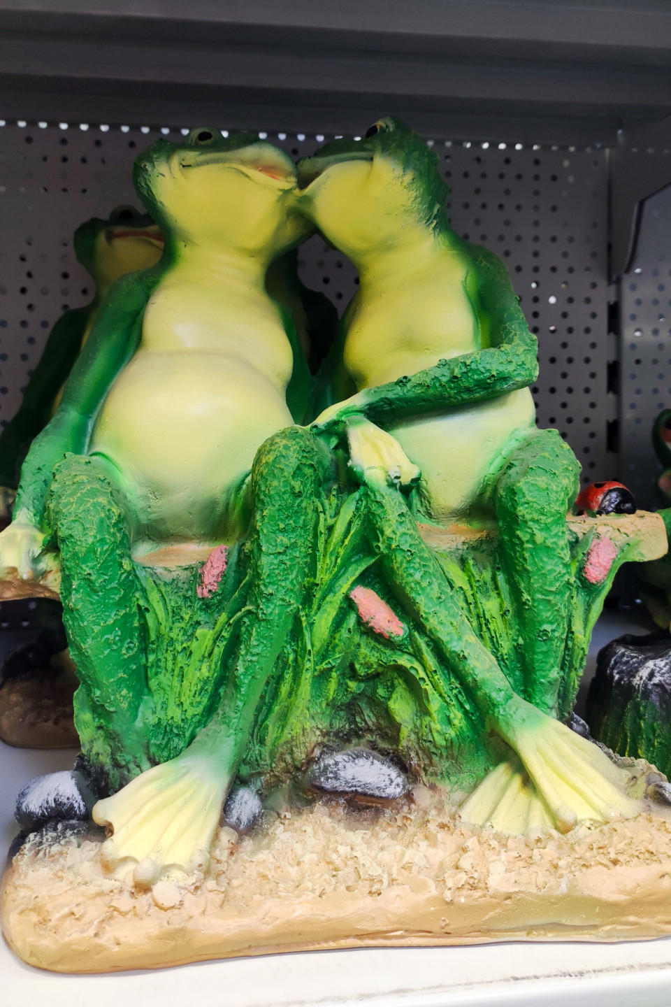 На изображении представлена декоративная композиция из двух сидящих рядом фигурок лягушек, выполненных из окрашенного материала и установленных на стилизованной коряге с имитацией мха и камней. Фигурки имеют зелёно-жёлтую окраску и расположены в позе тесного контакта. На фоне видны дополнительные аналогичные изделия, размещённые на стеллаже магазина. Освещение искусственное, с тенями от полок. Фотография подходит для каталогов декоративных изделий, обзоров садовых украшений или оформления рекламных материалов магазинов товаров для сада.