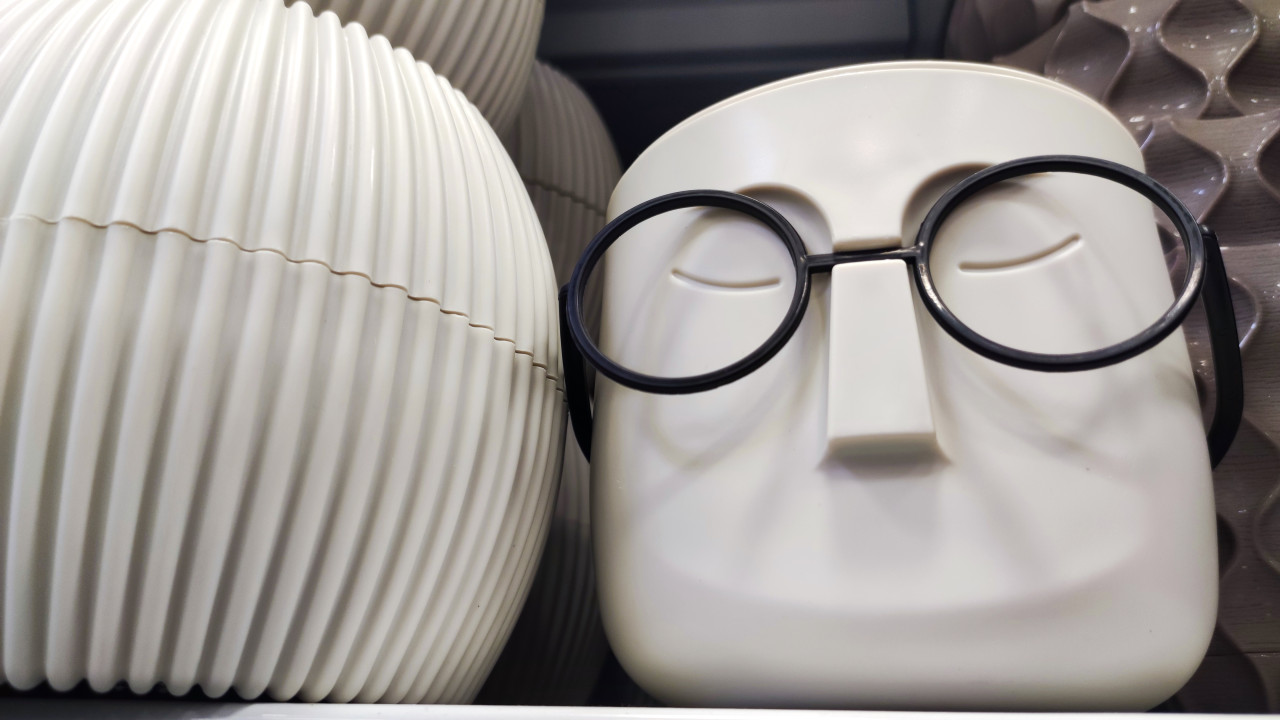 На фотографии крупным планом показано декоративное кашпо светлого цвета, выполненное в форме стилизованного лица с закрытыми глазами и чёрными круглыми очками. Рядом расположено рифлёное кашпо аналогичного оттенка. Изделия выставлены на полке магазина товаров для дома. Освещение верхнее, подчёркивающее форму и фактуру предметов. Снимок подходит для каталогов интерьерного декора, описаний дизайнерских аксессуаров и визуального наполнения интернет-магазинов.
