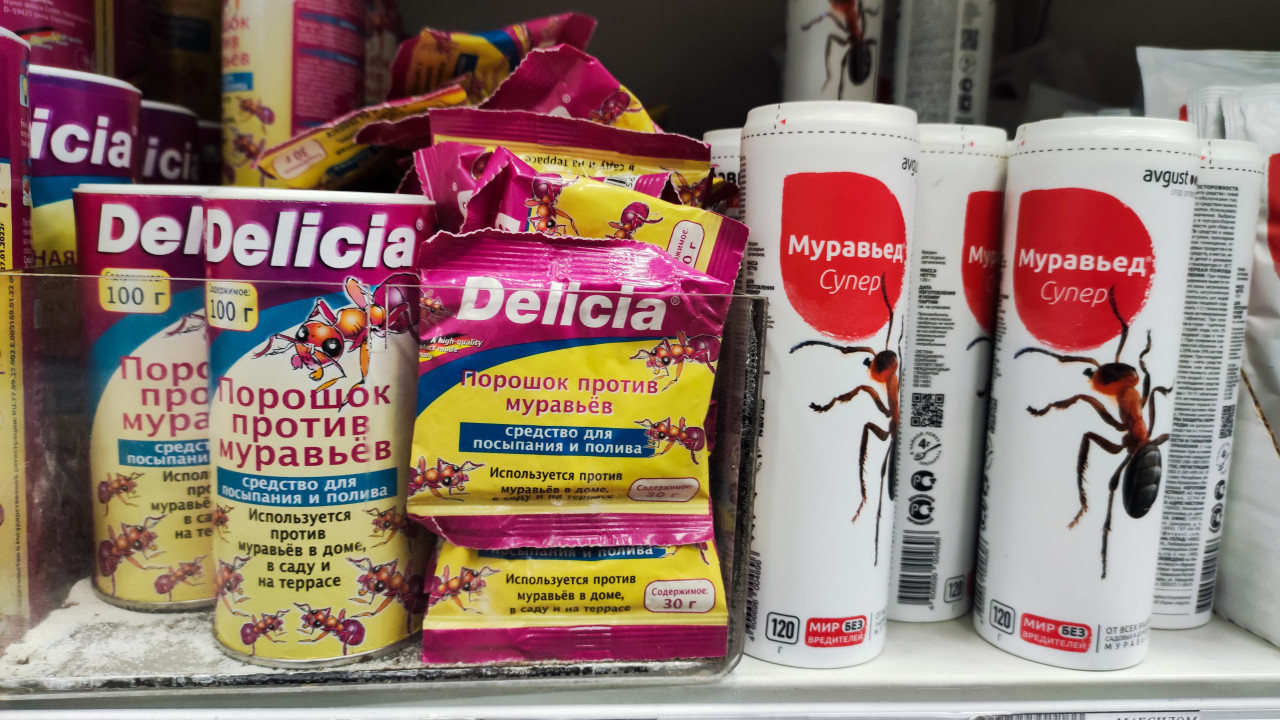 Ассортимент средств против муравьев Delicia и «Муравьед Супер» на полке