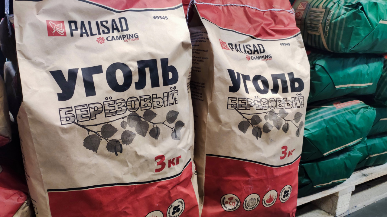 Мешки с березовым углем в магазине