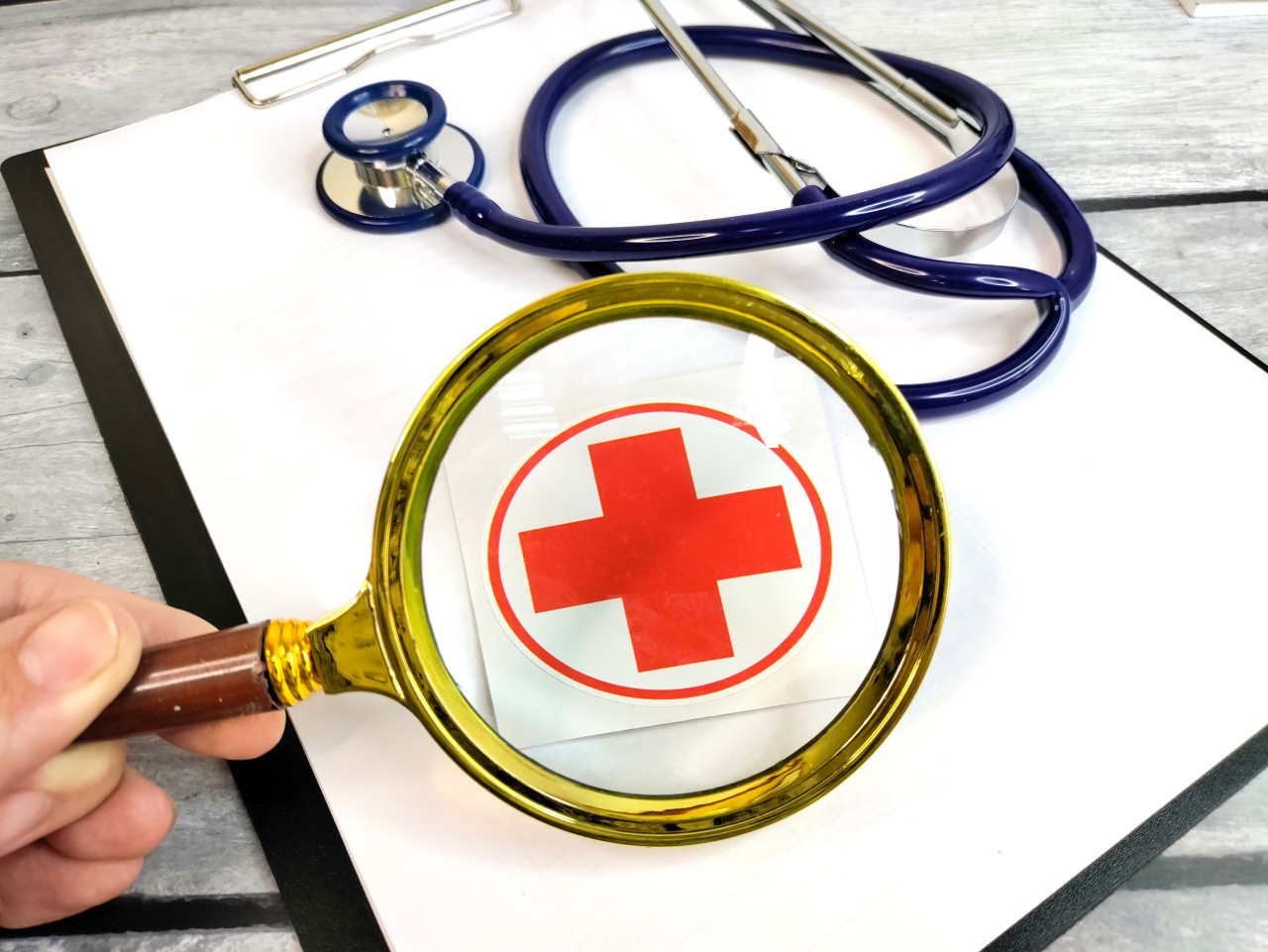 На фотографии показано увеличительное стекло с металлической оправой, расположенное над медицинским символом в виде красного креста на белом фоне. Рядом на поверхности лежит стетоскоп с гибкими синими трубками и металлическими элементами, а также планшет с листом бумаги. Композиция ассоциируется с проверкой, анализом и экспертизой в сфере здравоохранения. Снимок может использоваться в материалах о медицинской экспертизе, контроле качества медицинских услуг, анализе медицинской документации и профессиональной оценке состояния здоровья.