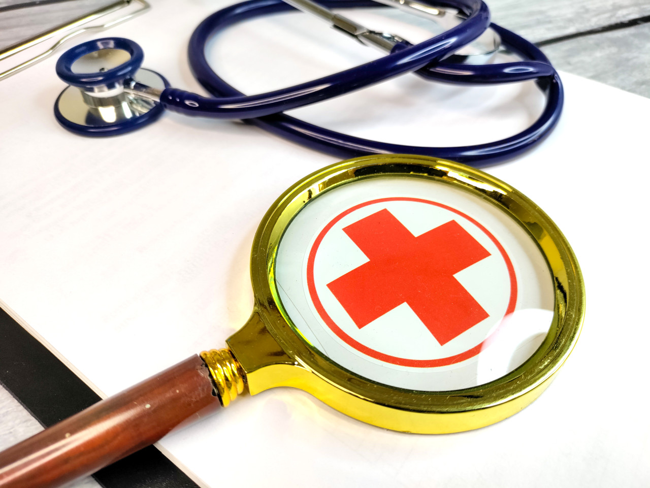 На снимке изображено увеличительное стекло, под которым размещён символ медицины — красный крест. На заднем плане виден стетоскоп, разложенный на поверхности рядом с планшетом для документов. Композиция подчёркивает тему анализа и контроля в медицинской сфере. Фотография может использоваться в материалах о медицинской экспертизе, проверке медицинских заключений, страховых спорах, а также в иллюстрациях, связанных с профессиональной медицинской оценкой и аудитом качества услуг.