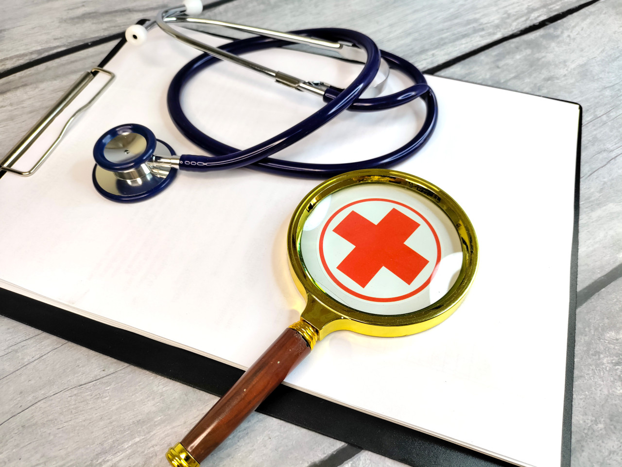 На фотографии изображено увеличительное стекло с золотистой металлической оправой, под которым расположен медицинский символ в виде красного креста на белом фоне. На заднем плане виден стетоскоп с синими трубками и металлическими элементами, лежащий на планшете с листом бумаги. Рабочая поверхность выполнена из светлого дерева. Сцена иллюстрирует процесс анализа, проверки или экспертной оценки в сфере здравоохранения. Фотография может использоваться в материалах о медицинской экспертизе, контроле качества медицинских услуг, страховой медицине и анализе медицинской документации.