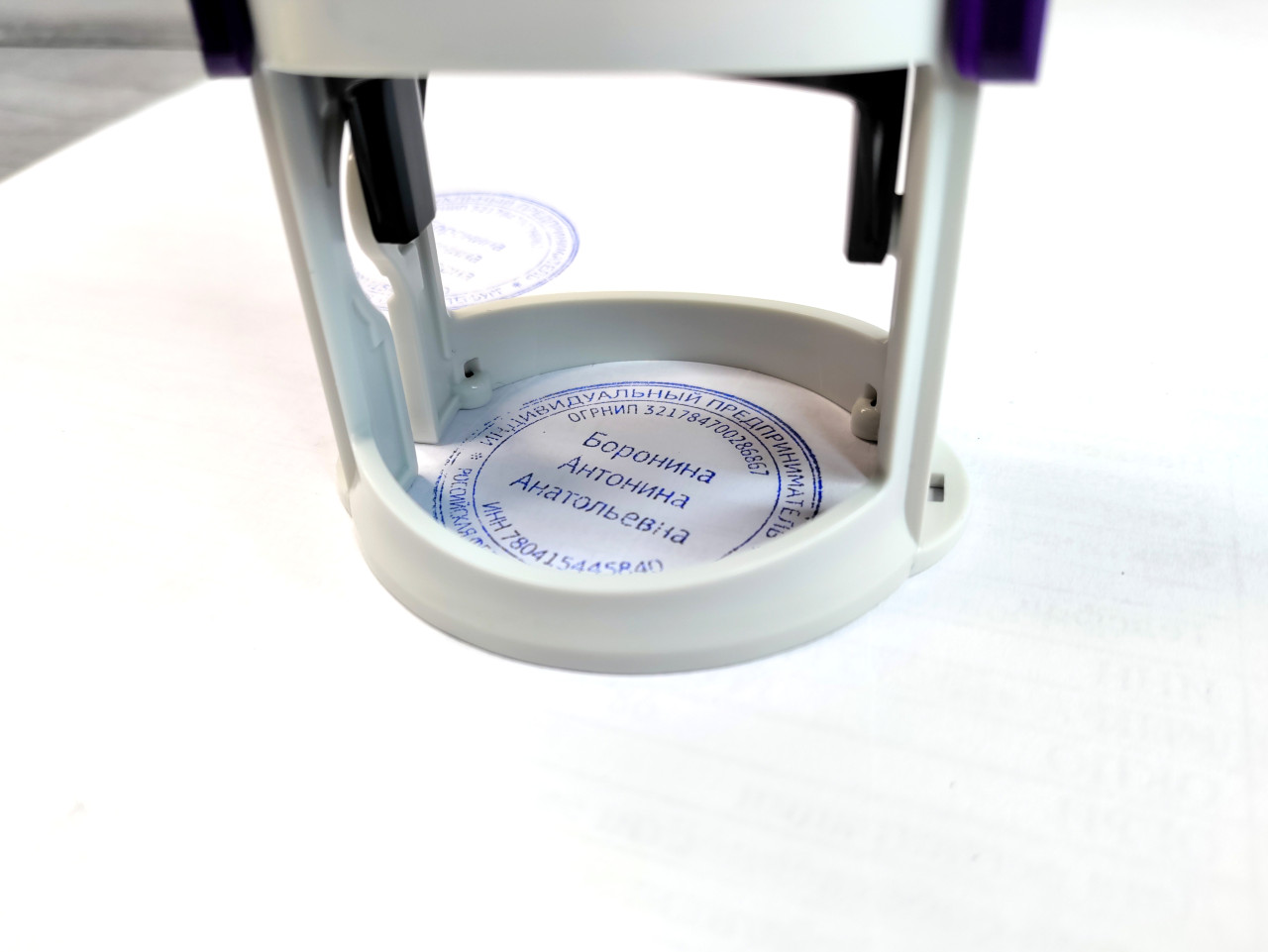 На фотографии показан нижний рабочий механизм автоматического штампа, установленного на листе бумаги. Внутри корпуса хорошо различим круглый оттиск печати с текстом «Индивидуальный предприниматель» и персональными данными, выполненный синими чернилами. Детали корпуса штампа и чистый фон подчёркивают процесс официального заверения документа. Снимок иллюстрирует этап оформления и подтверждения подлинности документов и может использоваться в материалах о делопроизводстве, юридической практике, экспертизе документов и административных процедурах.