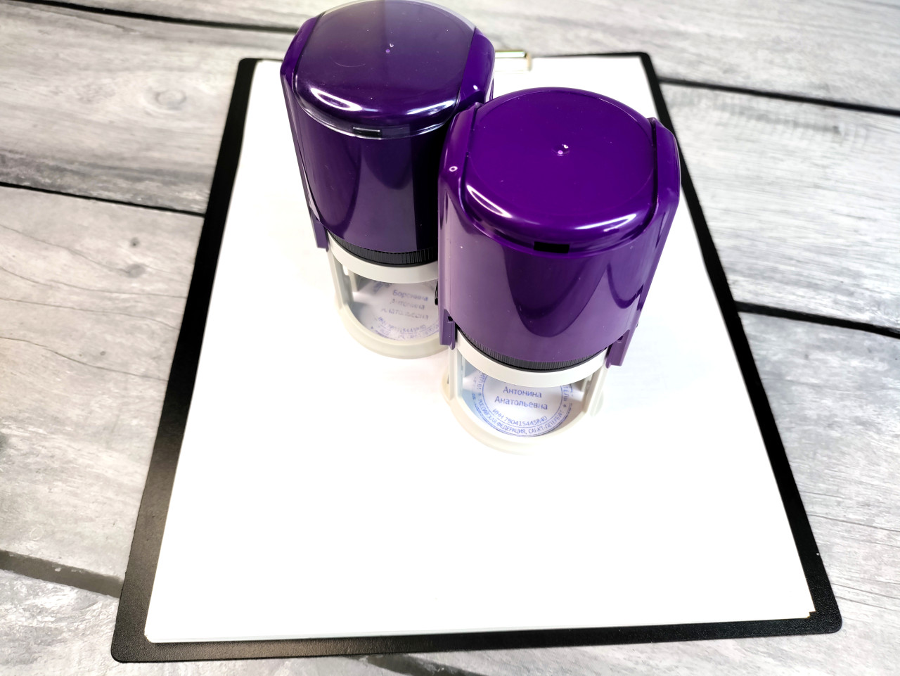 На снимке показаны два автоматических штампа с фиолетовыми корпусами, установленные на планшете с чистым листом бумаги. Через прозрачные элементы корпусов различимы круглые печати с текстом и реквизитами. Планшет с металлическим зажимом размещён на деревянной поверхности. Фотография передаёт тему делопроизводства, оформления и заверения документов. Изображение подходит для иллюстрации материалов о документообороте, экспертизе, юридической и медицинской практике, а также процессах подтверждения подлинности официальных бумаг.