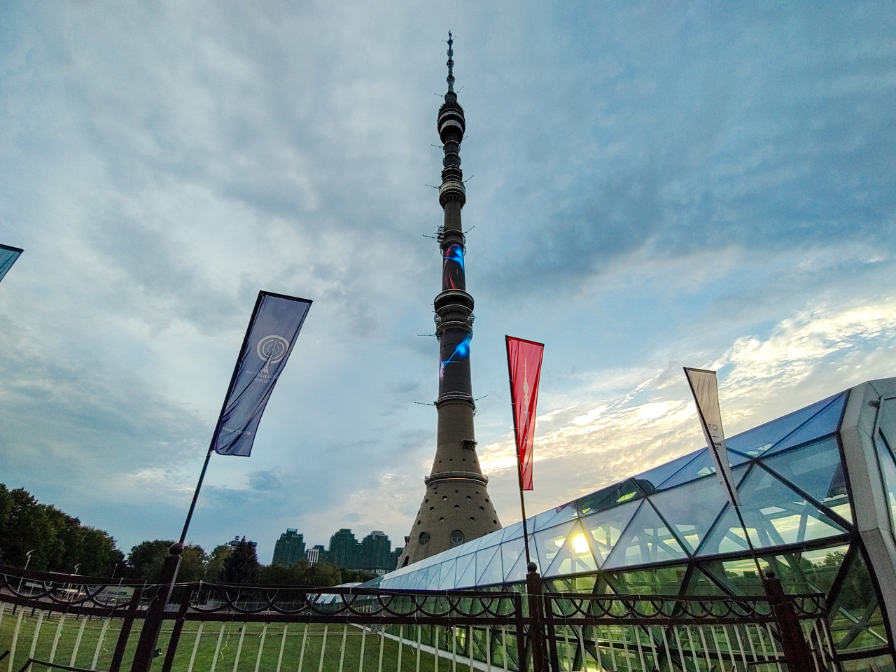 Останкинская телебашня с флагштоками на прилегающей территории