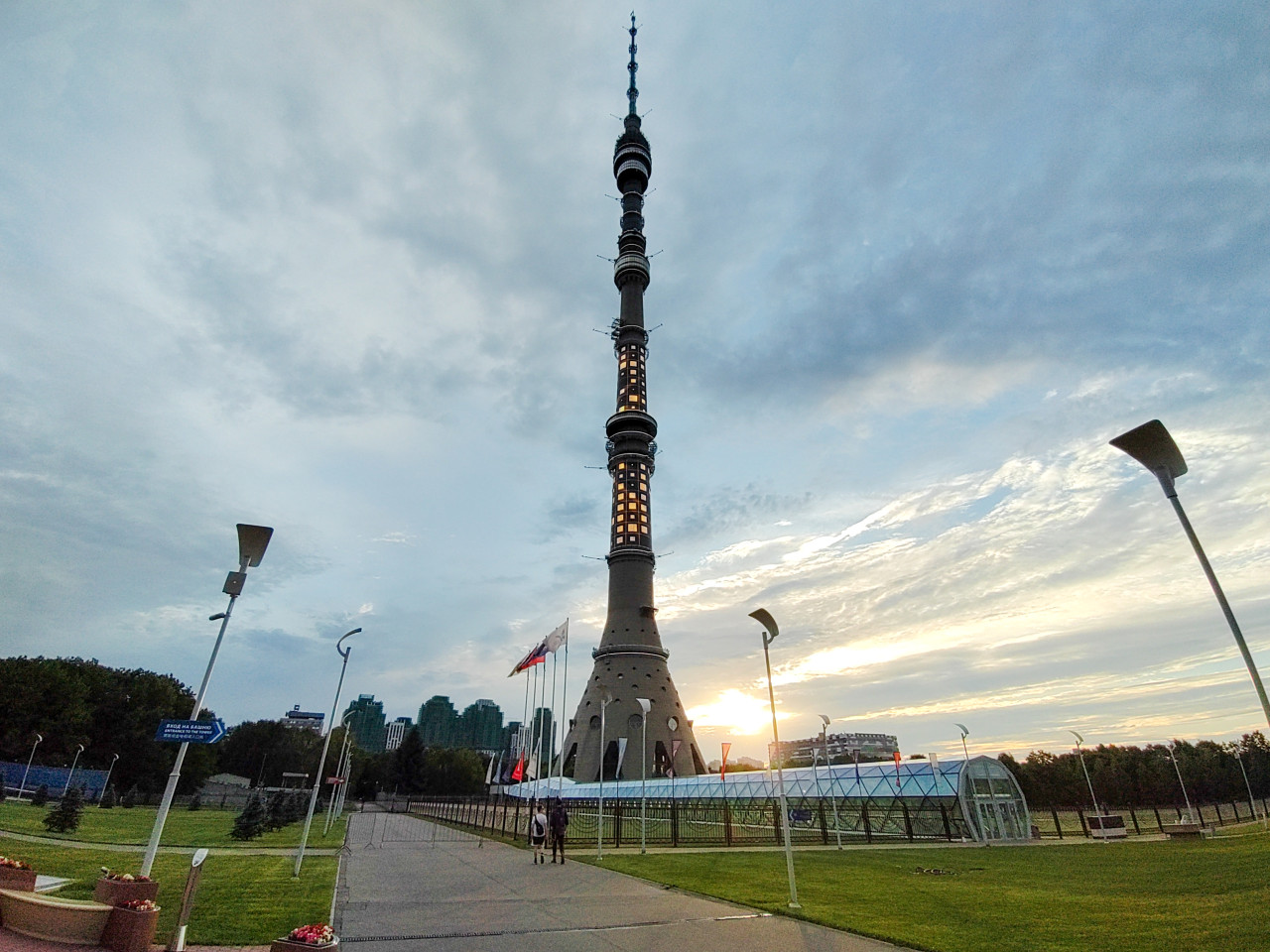 телебашня телевышка архитектура инженерное сооружение москва останкинская телебашня объект культурного наследия высотное сооружение телерадиовещание коммуникации городская инфраструктура городской пейзаж туристический объект символ города архитектурный объект Москва Останкинская телебашня закат вечернее небо пешеходная аллея уличные фонари флагштоки газон городская среда стеклянный переход инфраструктура общественное пространство дорожка панорама инженерия открытая территорияПохожие фотографии