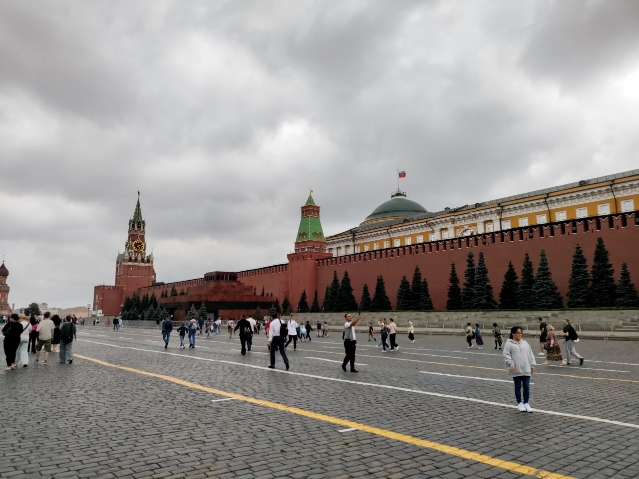 На фотографии запечатлён участок Красной площади с мощёным камнем и пешеходами на фоне южной стены Московского Кремля. В кадре хорошо различима Спасская башня с курантами, одна из самых узнаваемых башен Кремля, построенная в 1491 году архитектором Пьетро Антонио Солари. Видна кремлёвская стена с зубцами и декоративными елями вдоль неё, а также фрагмент здания Сената с куполом и государственным флагом. Снимок сделан в пасмурную погоду и отражает повседневную туристическую активность исторического центра Москвы. Фотография подходит для иллюстраций о достопримечательностях России, городской среде, туризме и истории.