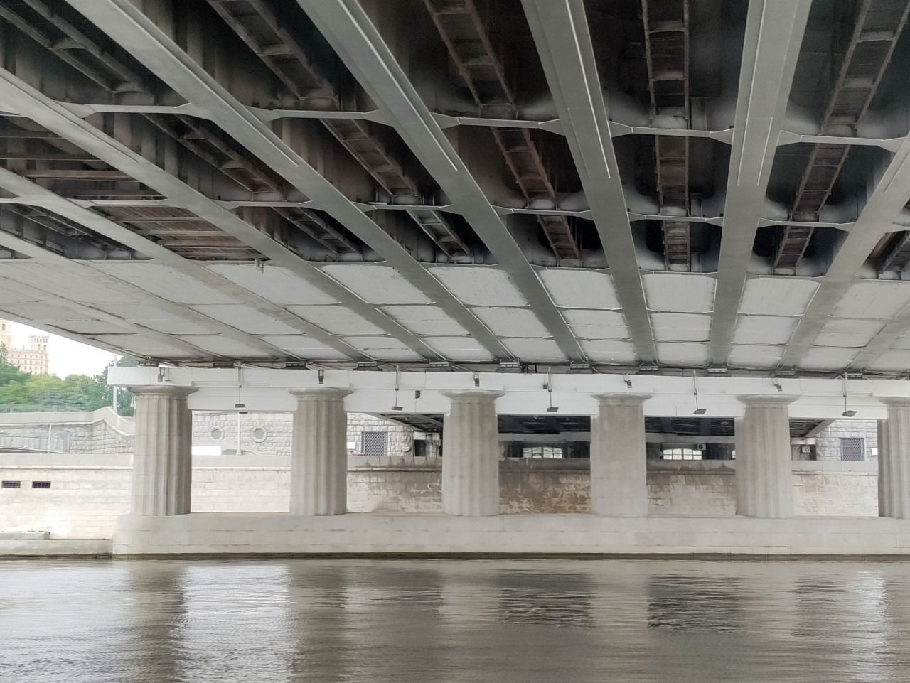 На фотографии показано пространство под Новоарбатским мостом в Москве с видом на массивные бетонные опоры и металлические пролётные конструкции. В кадре отчётливо видны несущие балки, элементы перекрытий, инженерные крепления и водная поверхность Москвы-реки. Мост соединяет Новый Арбат и Кутузовский проспект и является важной частью транспортной системы центра города. Новоарбатский мост был открыт в 1957 году и стал одним из ключевых инженерных сооружений послевоенной Москвы. Изображение подходит для материалов о городской инфраструктуре, транспорте и инженерной архитектуре.