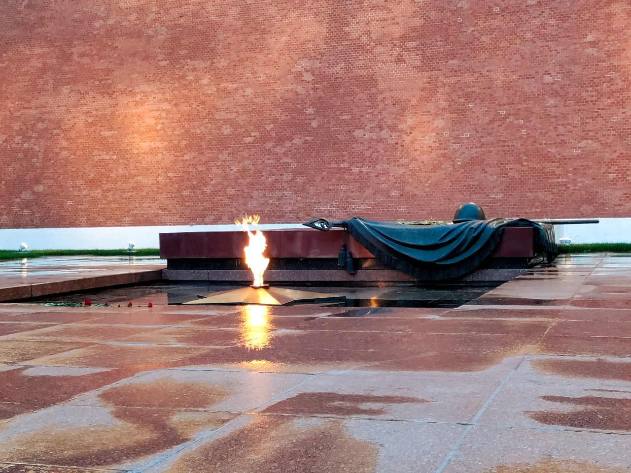 На фотографии запечатлён Вечный огонь Могилы Неизвестного Солдата в Александровском саду у Кремлёвской стены в Москве. В центре кадра видно пламя, горящее в бронзовой пятиконечной звезде, отражение огня на мокрых гранитных плитах, элементы мемориальной площадки и фрагмент кирпичной стены Кремля. Мемориал открыт в 1967 году и посвящён советским воинам, погибшим в годы Великой Отечественной войны. Объект является памятником истории и культуры федерального значения. Фотография подходит для материалов о военной истории, мемориалах, памятных датах и государственной символике.