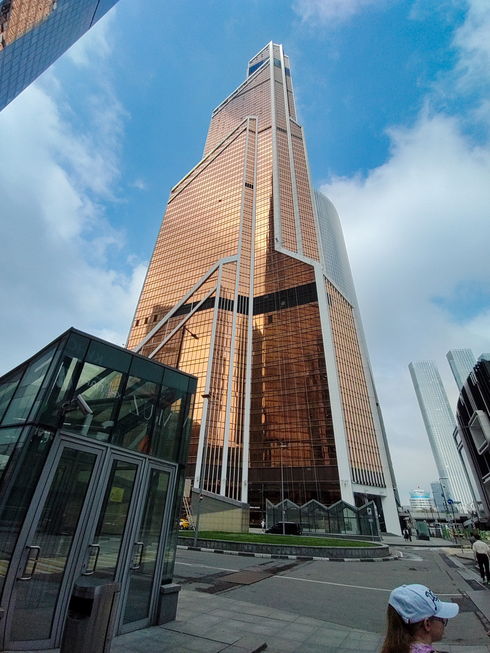 На изображении представлен небоскрёб «Меркурий Сити Тауэр» — одно из самых узнаваемых зданий делового центра «Москва-Сити». Башня выделяется фасадом с медно-золотистым остеклением и сложной геометрией. Здание построено в 2013 году по проекту архитекторов Михаила Посохина и Фрэнка Уильямса и в момент завершения было одним из самых высоких в Европе. Снимок сделан с уровня улицы, что подчёркивает масштаб сооружения и окружающую современную застройку. Фотография подходит для иллюстраций современной архитектуры, бизнеса и городского развития.