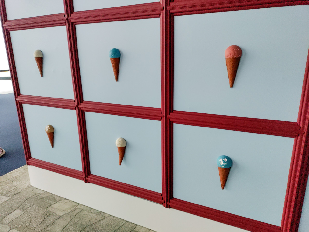 На фотографии показан декоративный элемент интерьера фабрики мороженого «Чистая линия», расположенной на 89-м этаже башни «Федерация. Восток» в комплексе Москва-Сити. В кадре видна стена, оформленная светло-голубыми панелями с красной рамной сеткой, на которых закреплены объемные муляжи рожков мороженого разных цветов. Такой дизайн используется как часть музейно-развлекательного пространства PANORAMA360 и служит фотозоной для посетителей. Снимок сделан внутри смотровой площадки и может применяться в материалах о тематическом дизайне интерьеров, индустрии развлечений и семейном досуге.