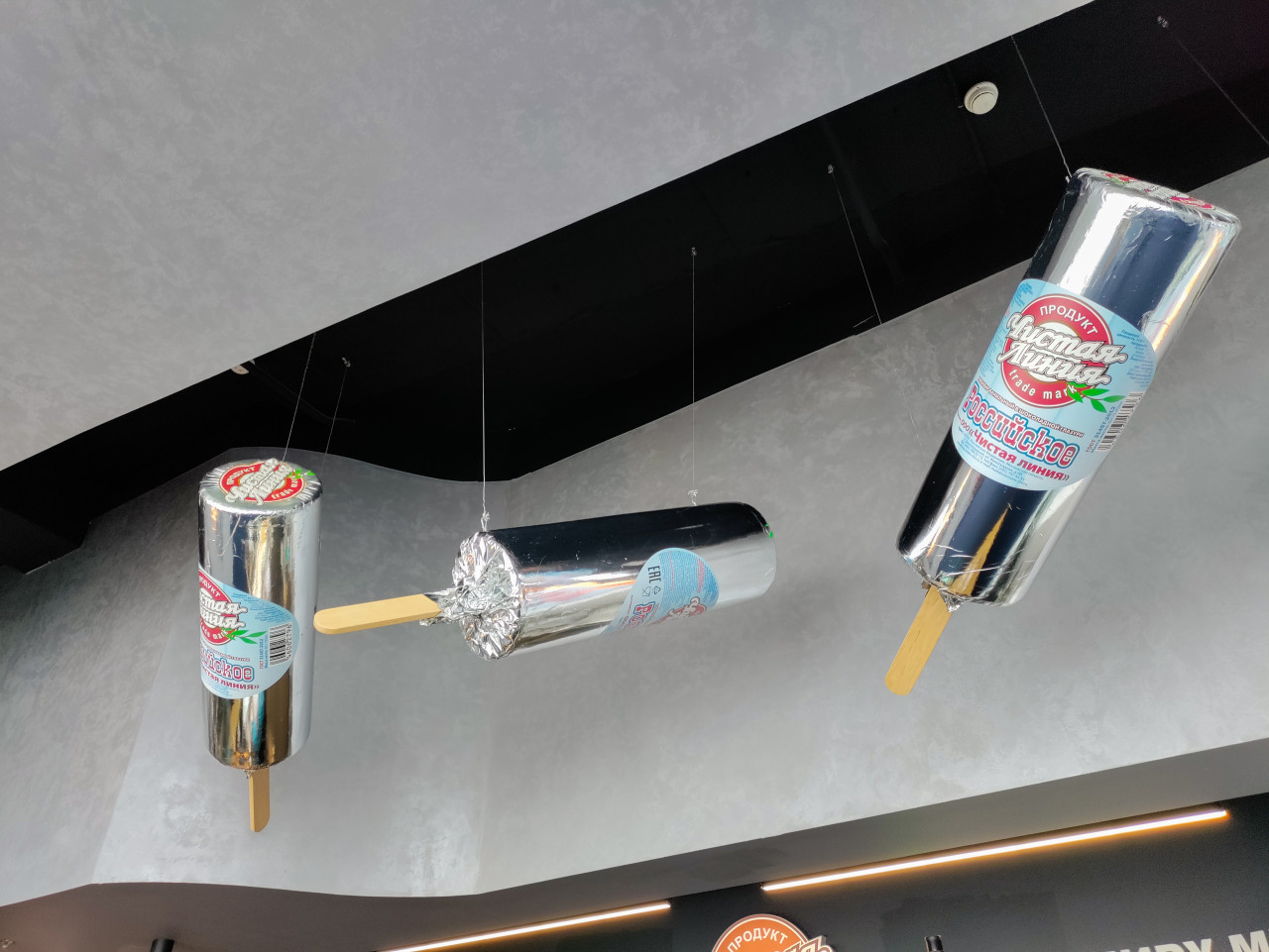 На фотографии запечатлена группа декоративных макетов эскимо, подвешенных под потолком в интерьере фабрики мороженого «Чистая линия» на смотровой площадке PANORAMA360. В кадре видны несколько увеличенных муляжей мороженого в фольгированной упаковке с палочками, размещённых на разной высоте. Элемент используется для создания узнаваемой атмосферы и визуальной навигации внутри пространства. Снимок может применяться в публикациях об общественных интерьерах, музейном и выставочном дизайне, а также тематическом оформлении гастрономических объектов.